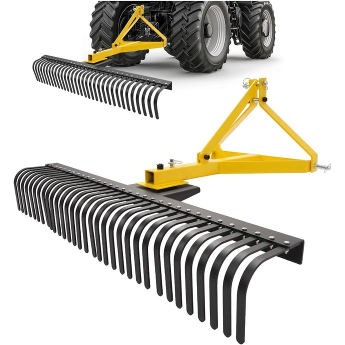 KUAFU 60In Landscape Rake, 3 Point Rake, 360 Rotation Compatible with Category 1, Cat1 Tractors Tow-Behind Garden Tool for Garden, Farm, Clearing Brush, Raking Arenas 2 Package Yellow